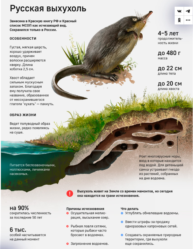 Русская выхухоль – уникальный краснокнижный вид, эндемик водно-болотных угодий. Долгие годы выхухоль была объектом охотничьего промысла из-за своего меха и мускусной железы. Численность вида быстро сокращалась и в первой половине ХХ века охота на выхухоль в нашей стране была запрещена.