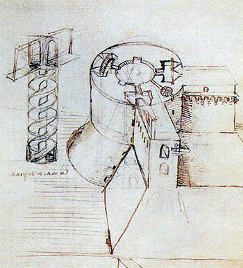 Воздушный винт, которому Леонардо придал форму геликоида, упоминается в его знаменитом трактате «О летании». Согласно описанию, винт должен иметь металлическую окантовку и полотняное покрытие, а каркасом полотну послужат тонкие длинные трубки. И далее да Винчи добавляет: «Можно сделать себе маленькую модель из бумаги, ось которой, из тонкого листового железа, закручиваемая с силой и которая будучи отпущена, приводит во вращение винт». Ну а дальше додумывайте сами... Судя по деталям конструкции, винт могли вращать с помощью приделанных к оси рычагов. Или «запускать» его мог пружинный механизм. А что такое пружина? Да та же винтовая линия, выполненная в металле, способная накапливать и отдавать энергию.