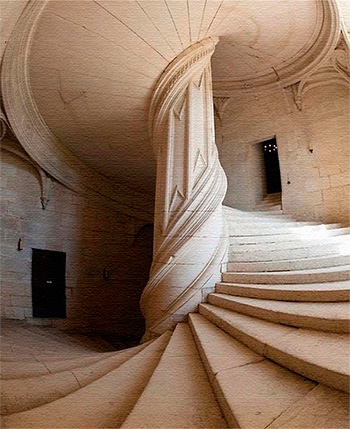 Двойная винтовая лестница украшает королевский замок Шамбор во Франции. Его строительство началось в 1519 году, вскоре после кончины Леонардо. Как известно, последние годы жизни он провёл в этой стране, при дворе Франциска I, своего покровителя, и был Первым королевским художником, инженером и архитектором.