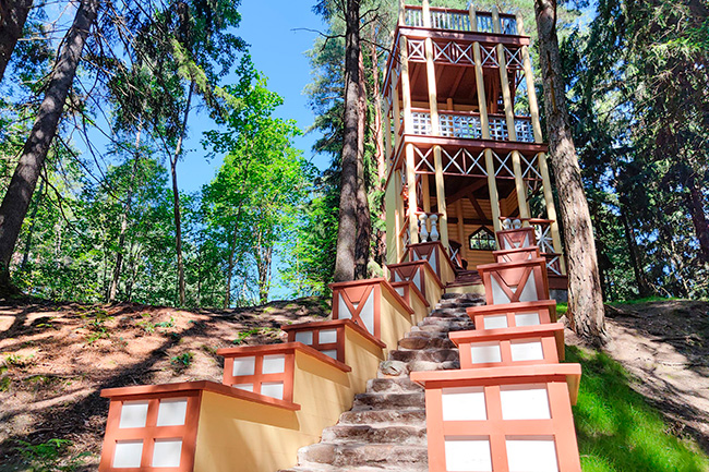 Одной из задумок Ильи Ефимовича по благоустройству усадебного парка стали многочисленные беседки, которые не только украшали парк, но и несли вполне утилитарное назначение. Самой заметной, несомненно, является беседка «Башенка Шехерезады». В репинские времена на ее верхней площадке устраивались чаепития, там же была установлена подзорная труба, с помощью которой гости могли рассматривать Финский залив и панораму Кронштадта. Об этом причудливом репинском сооружении упоминали почти все, кто бывал в «Пенатах».