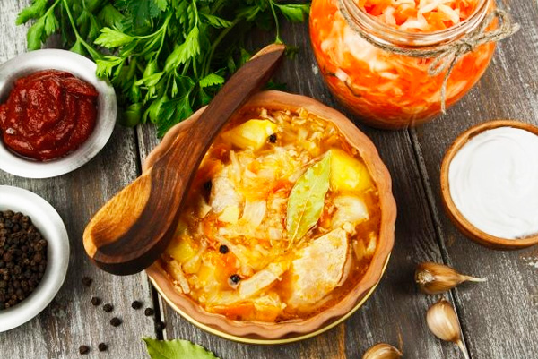 Правила приготовления. Поставить вариться белый бульон и после снятия с него пены прибавить букет, соль и отставить на край плиты. Приготовить шинкованную или рубленую кислую капусту, выбрать из неё все кочерыжки, отжать досуха в салфетке и мелко изрубить. Нашинковав лук, отколеровать его на масле, прибавить к нему отжатую капусту, прожарить её, помешивая, пока она сделается красная и мягкая; прибавить немного пюре томатов, всыпать муку, прожарить ещё раз. Часа за 1,5 или 2 до подачи к столу прибавить в капусту процеженный бульон, положить душистого перцу, лаврового листу, опустить в щи обмытое мясо и поставить довариваться. Перед подачей на стол положить сметану и прокипятить. Кислые щи подаются с гренками из гречневой каши или с рассыпчатой гречневой кашей.