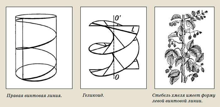 Цилиндрическая винтовая линия может перемещаться вдоль самой себя. Она определяет кратчайший путь между двумя точками разных образующих на поверхности цилиндра. Аналогичными свойствами обладает геликоид. Он скользит сам по себе и имеет минимальную площадь при заданной внешней границе. Простота, гибкость, динамичность, «экономичность» — благодаря этим свойствам винтовые формы распространены в природе (вспомним хотя бы «двойную спираль» молекулы ДНК и вьющиеся растения) и широко применяются на практике, особенно в технике (от пружины и штопора — до шнека мясорубки и гребного винта).